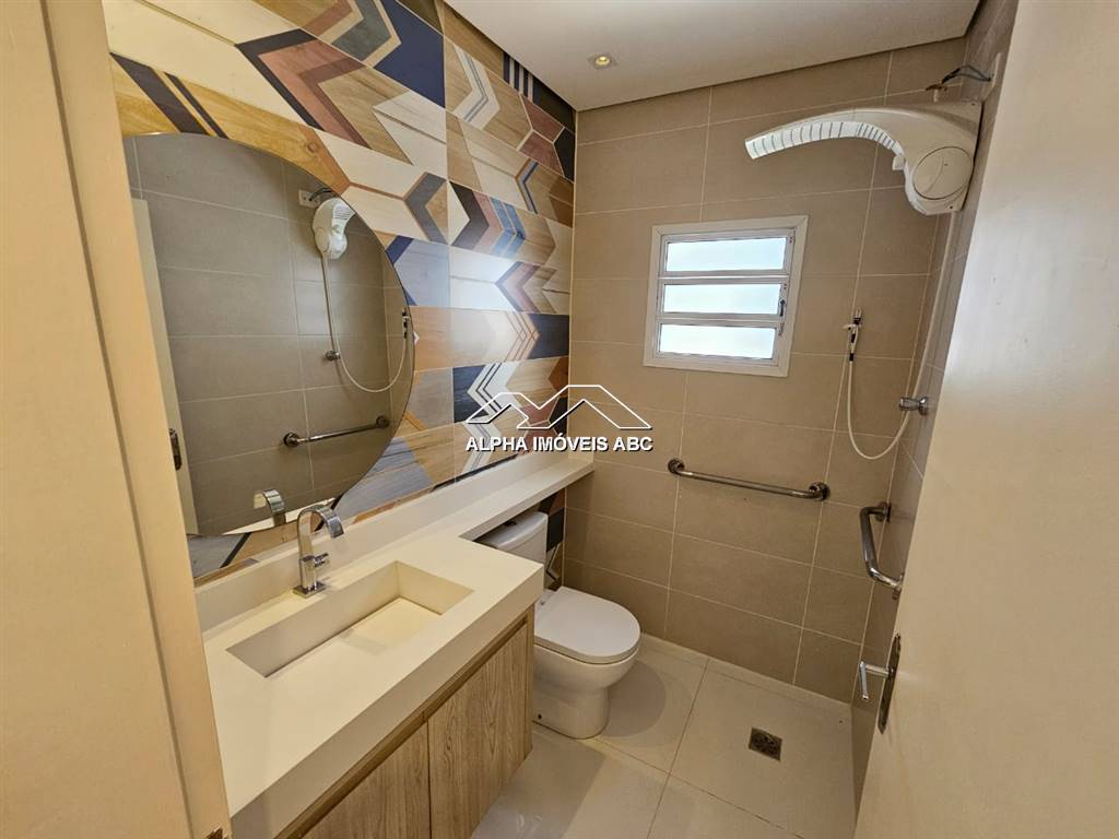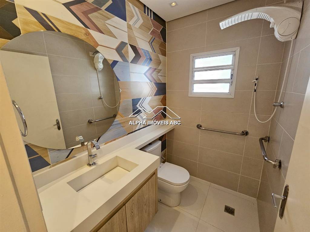 BANHEIRO SOCIAL: Banheiro com chuveiro elétrico. Espelho redondo com iluminação com spots. Pia com móvel planejado, pedra da cuba na cor branca com torneira cromada. Acompanha todos os acessórios do banheiro (Porta toalha de rosto e porta papel higiênico e lixeira).