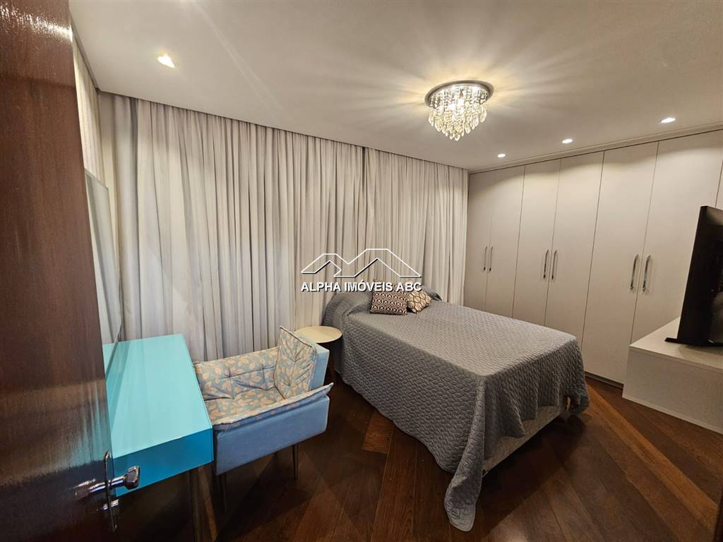 QUARTO SUPERIOR ? Quarto todo decorado com papel de parede, lustre, acompanha cama de casal com box baú e colchão, 02 mesas de cabeceira, painel com televisão Samsung Led 40 polegadas, com cortinas na cor branca, penteadeira com poltrona estofada, espelho e guarda-roupa amplo.